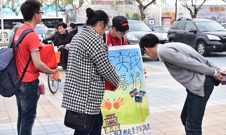 活动当天,队员们不言辛苦,相互鼓励,交流着募捐经验,叙述着感人故事,募捐在和睦的氛围中进行着。虽然是周六,江南摩尔一带并没有很多行人,但队员们一直坚守岗位,身体上的疲惫挡不住大家做公益的热情,每收到一份物资,队员们都会由衷地表示感激。正如一名实践队队员说的:“积少成多,即使是一份微小的心意,也是我们前进的动力。”