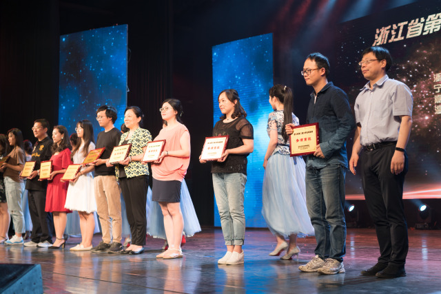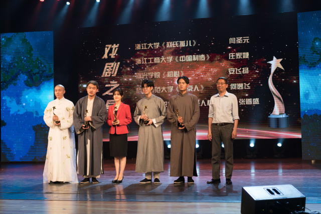 获奖的有浙江大学、浙江师范大学、宁波大学、嘉兴学院、浙江工商大学、杭州师范大学、温州大学、丽水学院、浙江艺术职业学院。啪啪啦 王金超同学获得话剧周导演奖。另外的导演奖获奖者有方桂林、沈骁婧、桂迎、史昕。《初心》中的安飞扬同学(饰毛泽东)获得戏剧之星。其余获奖者为“戏剧之星”获得者是何逸飞(杭州师范大学《北京人》)、庄家婕(浙江工商大学《中国制造》)、闫圣元(浙江大学《赵氏孤儿》)、张着盛(浙江艺术职业学院《茶人杭天醉》)。演员扎实的台词功底,富有感染力的舞台表现力让每一个观众都大呼过瘾,掌声久响不歇。