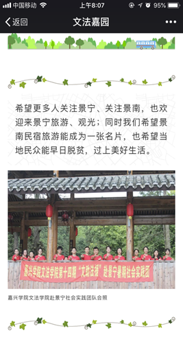 17年以来,嘉兴学院的志愿者们一直希望“能在支教,关爱景南留守儿童的基础上”,助力景南自身的发展。而对景南来说,发展民宿旅游是一条出路。因此,25日前后实践团成员积极走民宿景点,跑乡政府调研,希望能够助力“景南名片”的宣传。“云间与指尖、森林氧吧、畲族风情、仁孝节、竹工艺品文化、景南民俗体验等”,志愿者们通过微信公众号、暑期投稿,让更多人知道景南,希望为景南的“名宿、民风”站台,推介“景南名片”,希望更多投资商能关注到景南,也鼓励广大旅游爱好者前来观光,希望助力景南民生、早日脱贫,过上美好生活。