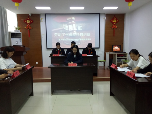 模拟法庭以贴近大众生活的“劳动工伤保险待遇纠纷”为主题。首先,在法庭准备阶段,书记员宣读了法庭纪律说明;接着,在合议庭审判长的主持下,围绕原告与被告之间争议的“是否应该保留原告与被告的劳动关系”、“被告是否应该赔偿原告所要求赔偿的经济损失金额及赔偿的具体内容”这两个焦点,原被告之间展开激烈的辩论陈述、举证与质证。 最后,对案件事实做了进一步认定,并结合相关劳动法条文规定,由审判长宣读判决书。
