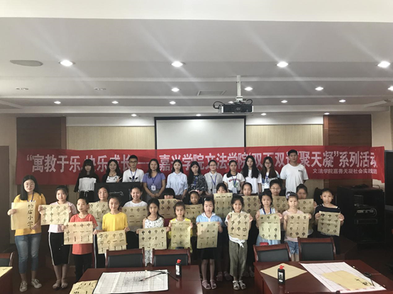 “双百双进”暑期社会实践团的同学们在嘉善天凝镇的杨庙小学开启了主题为“寓教于乐,快乐成长——国学下基层”活动,活动中嘉兴学院中文系的志愿者们给大家开设了软笔书法课堂与汉服课堂,向同学们普及了中国传统文化知识。这是志愿者与嘉善天凝镇团委共同对接承办的活动,共分为“知书”、“知礼”两个环节。过程中,还设置了汉字游戏,孩子们进入了“找错字”的游戏环节。