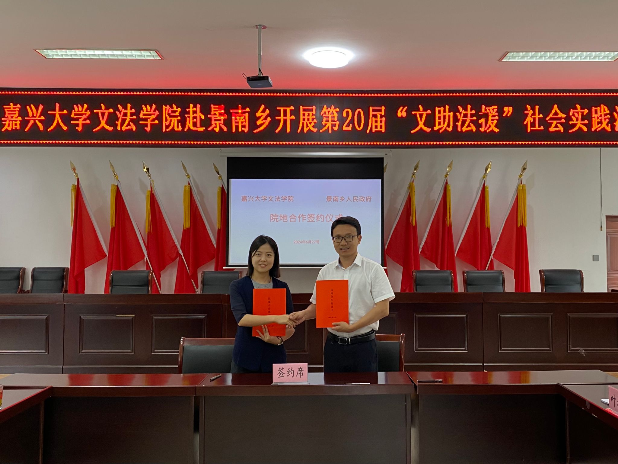 与景南乡人民政府进行了社会实践基地授牌仪式和院地合作签约仪式,这标志着双方由结识、结亲正式走向结盟,双方将共同探索院地合作新模式,为地方经济社会发展贡献智慧和力量。