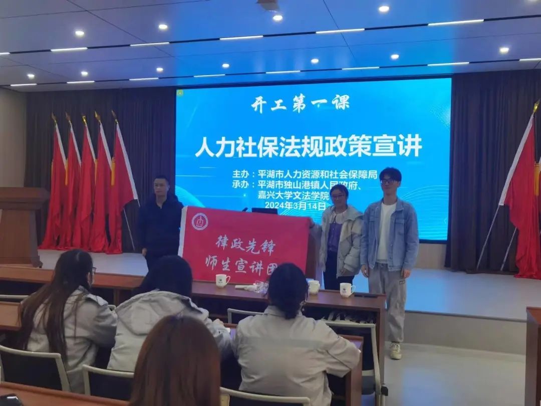 “律政先锋”法援行动“百名法学师生进百企”活动第一站在平湖独山港镇举行。本次活动是为贯彻落实全省“新春第一会”精神,全面加强“三支队伍”中高素养劳动者队伍建设,进一步营造稳定有序的就业和用工环境,扎实做好企业用工管理和劳动者权益保障工作,努力构建和谐稳定的劳动关系的重要行动。宣讲团由周述荣老师带队学生支部党员前往。