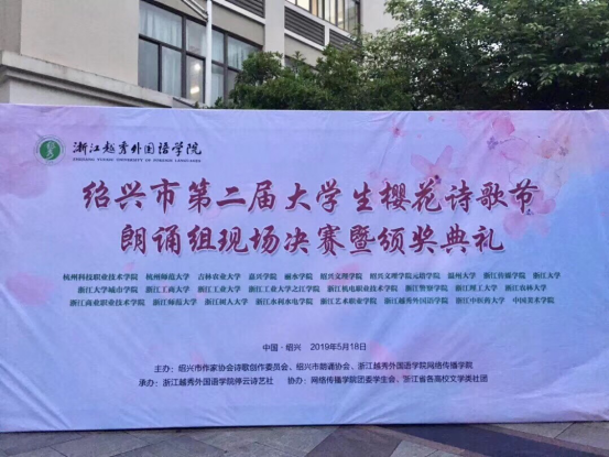 5月18日下午,绍兴市第二届大学生樱花诗歌节朗诵现场组决赛暨颁奖典礼在绍兴浙江越秀外国语学院镜湖校区举行。啪啪啦