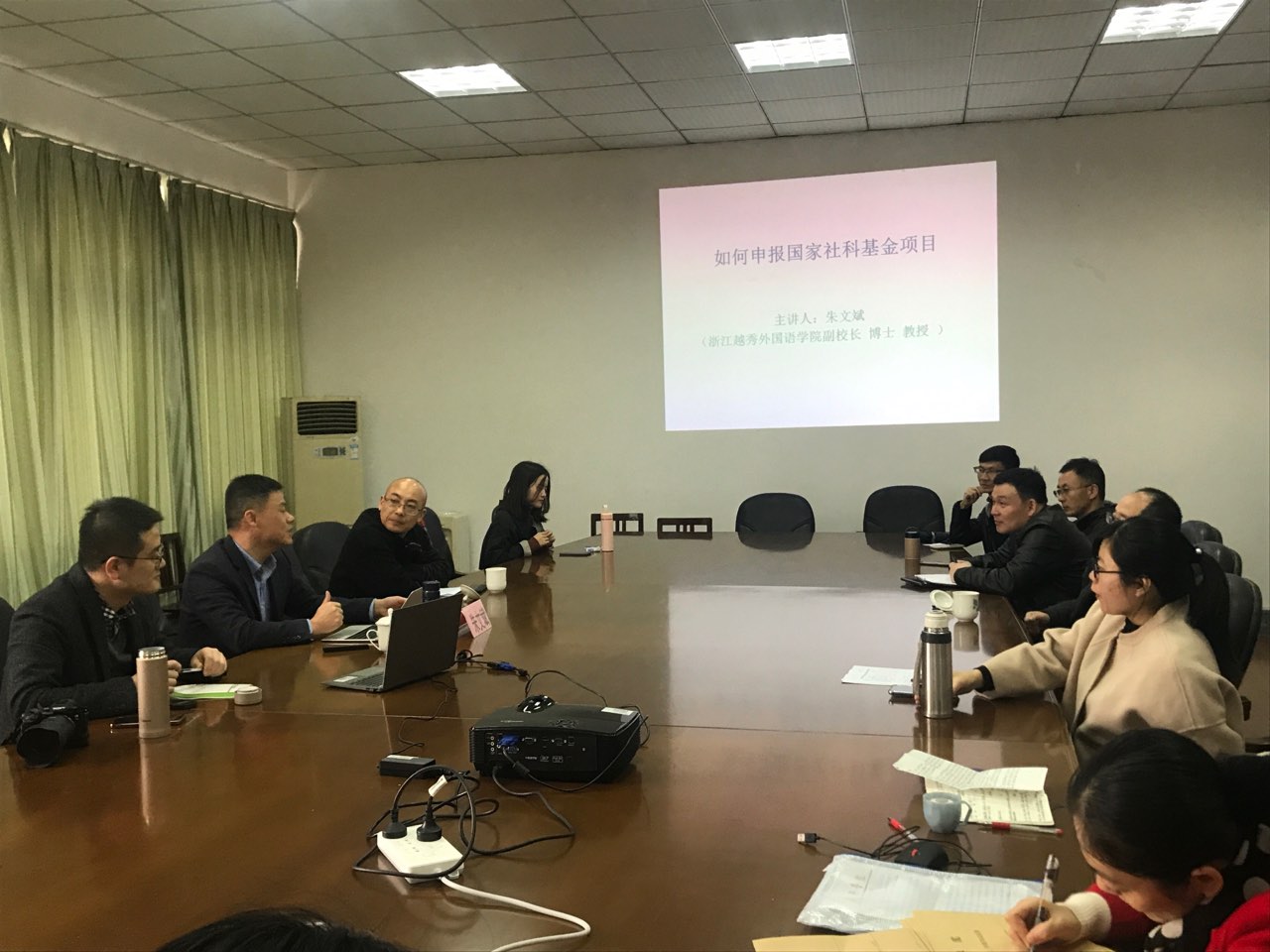 2020年11月26日下午,浙江越秀外国语学院副校长朱文斌应邀到啪啪啦 作题为“如何申报国家社科基金项目”的交流辅导会。此次辅导会在梁林校区一号楼426会议室举行。朱校长主要从课题申报的概况、相关的注意事项、如何填报申请书以及自己的心得体会等方面阐述了如何才能在国家社科基金项目的申报过程中取得成功。参会教师纷纷表示,本次国家社科基金申报辅导会让老师们受益匪浅。