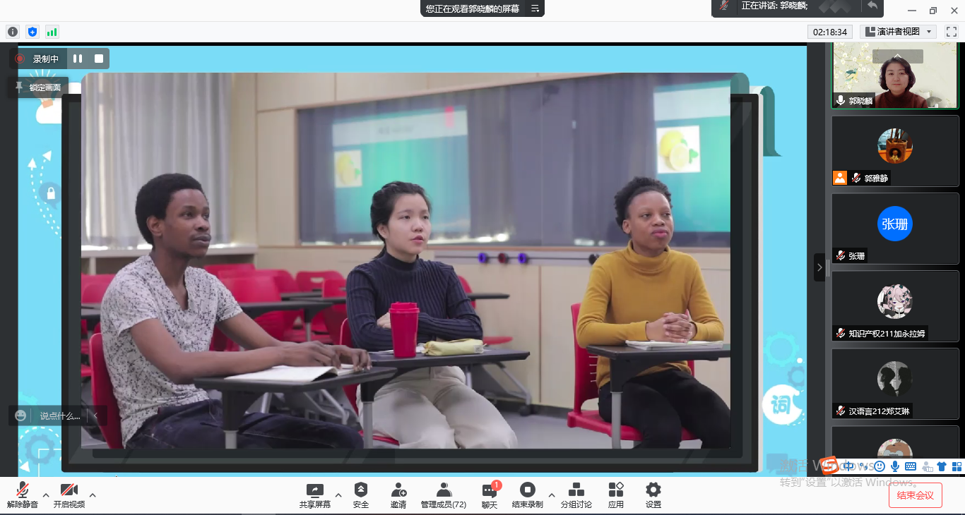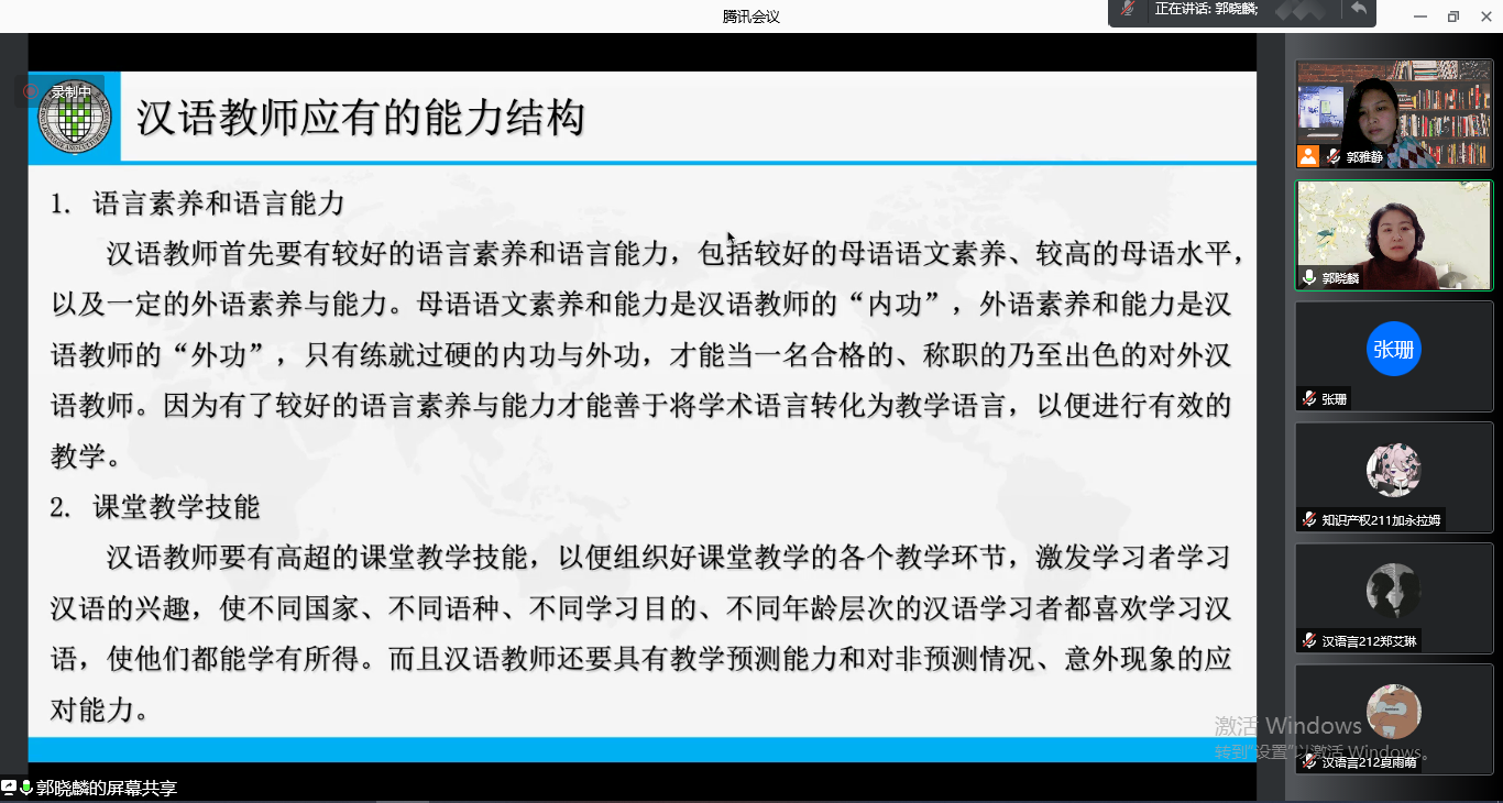 成功举办。为了积极配合疫情防控工作,本次讲座通过腾讯会议平台召开。本次讲座邀请了北京语言大学博士生导师郭晓麟教授,留学生教学团队教师,汉教专业、汉语言专业和法律专业学生等70余人参加了讲座。