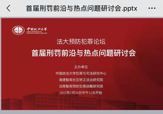 2022年2月26日,由中国政法大学犯罪与司法研究中心、海德智库社区矫正法治研究院、法商智库预防犯罪战略研究院联合主办的“首届刑罚前沿与热点问题研讨会”成功举办。来自北京大学、中国政法大学、西南政法大学、司法部预防犯罪研究所、浙江司法警官职业学院以及美国加州州立大学等20余所高校和各省监狱等司法实务部门的百余名专家学者和法律实践工作者参加了本次会议。
