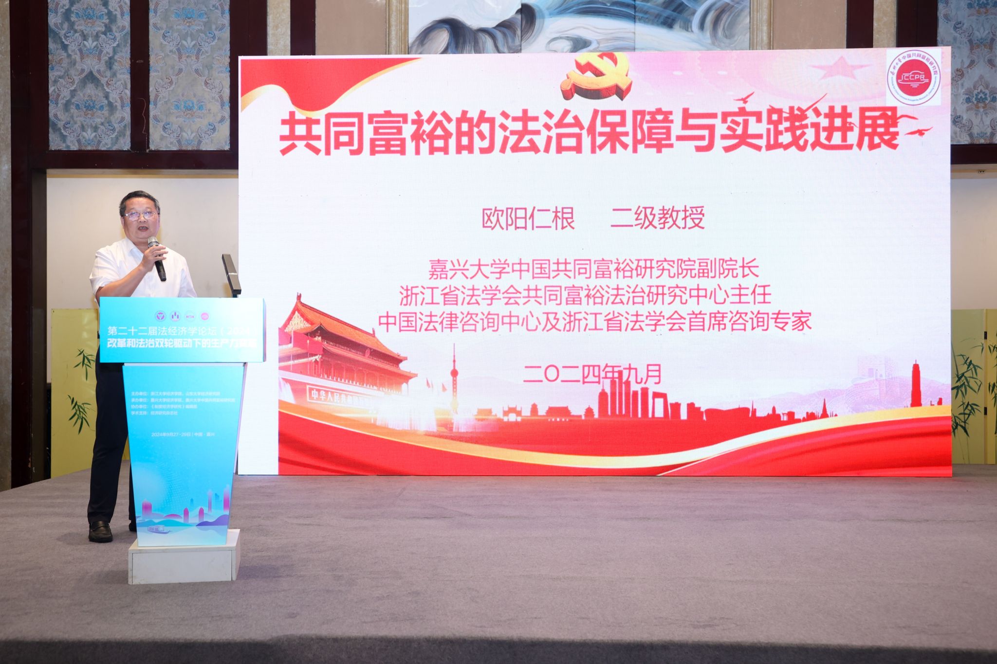 欧阳仁根教授在第二十二届法经济学论坛(2024)做了题为《共同富裕的法治保障与实践进展》的报告。该主旨报告在阐述共同富裕的丰富内涵与本质要求的基础上,从法治是助力和保障共同富裕的强大制度力量和共同富裕建设也推动着法治的发展和变革两个方面阐述了以法治方式促进共同富裕建设的功能。进而从以现代化党内法治强化共同富裕建设的组织领导、聚焦“做大蛋糕”,健全共同富裕建设中促进高质量发展的法律制度、聚焦“分好蛋糕”,健全共同富裕建设中缩小三大差距的法律制度、聚焦“人民中心”,健全共同富裕建设中促进人的全面发展的法律制度等方面对以现代化法治促进共同富裕建设的制度创新发表了看法,报告最后对以现代化法治促进共同富裕建设的浙江实践进行了概括梳理。