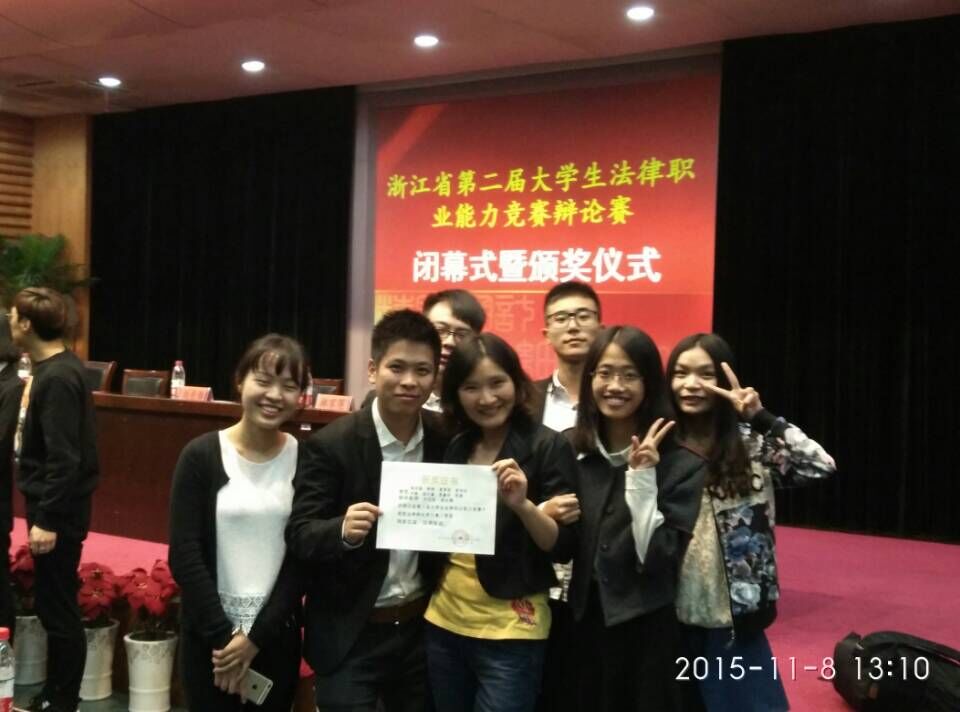 2015年11月6日至8日,浙江省第二届大学生法律职业能力竞赛法律辩论类比赛在中国计量学院进行现场比赛。来自全省32所高校的32支队伍,251名选手报名参赛。经过分组两两对决,每组前二名交叉再进行决赛,最终本届竞赛产生一等奖2个、二等奖6个,三等奖8个。啪啪啦