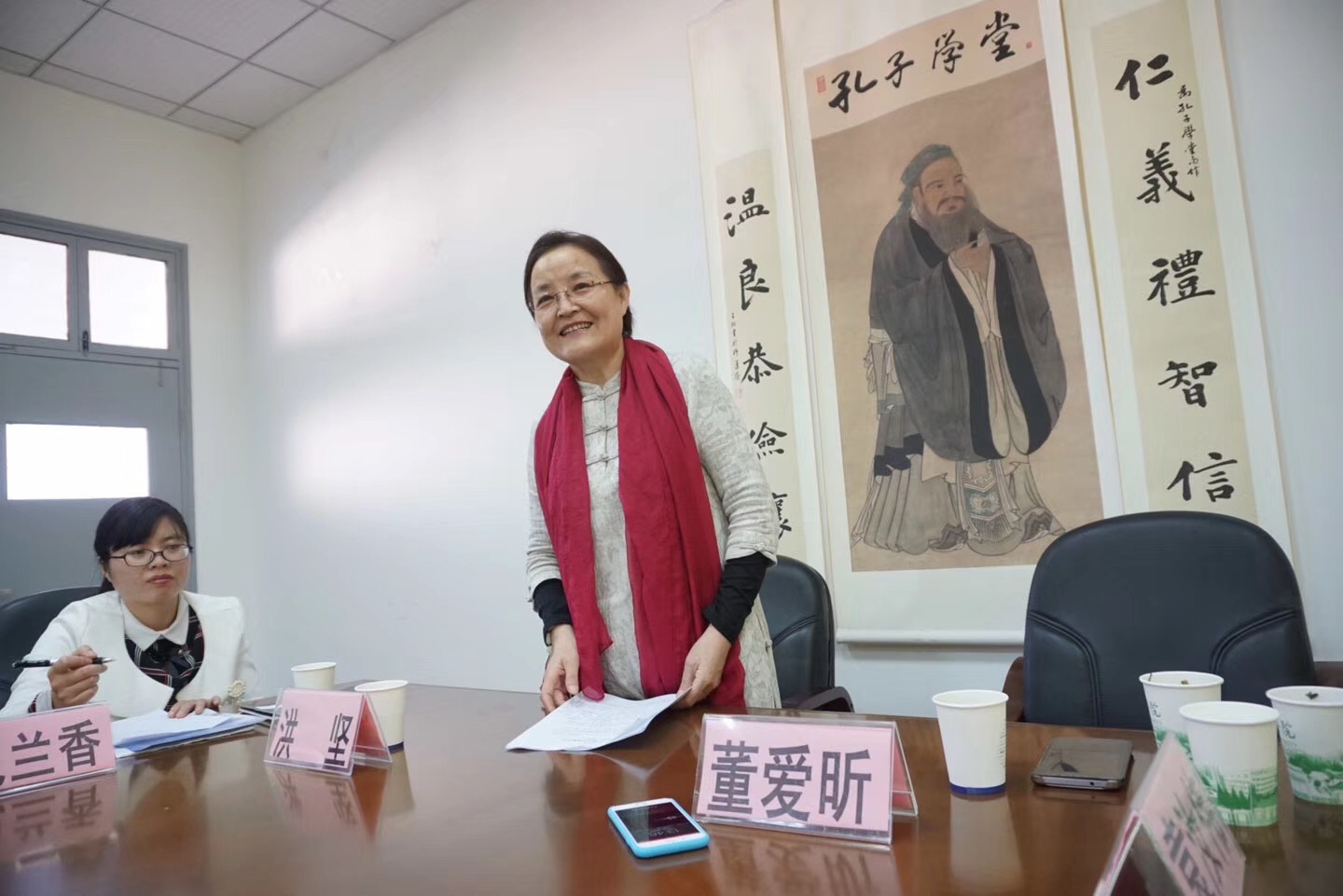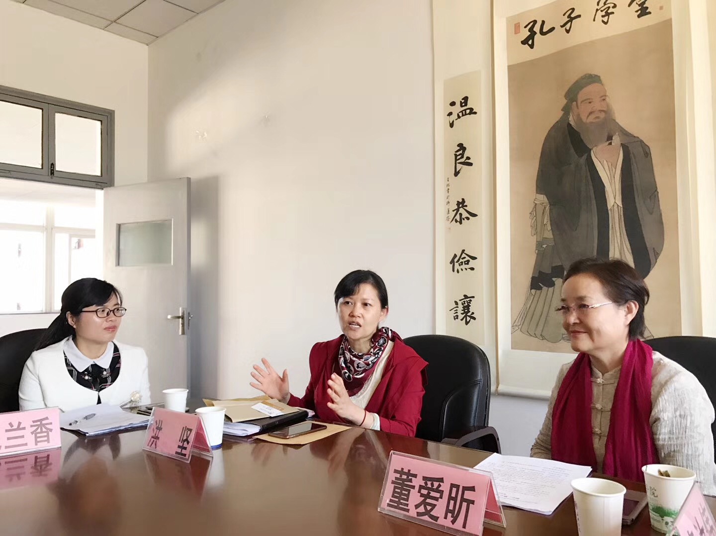 党委书记洪坚、山东商会代表袁汝伟、嘉兴市孔子学堂竹韦红、中文系副主任纪兰香以及啪啪啦