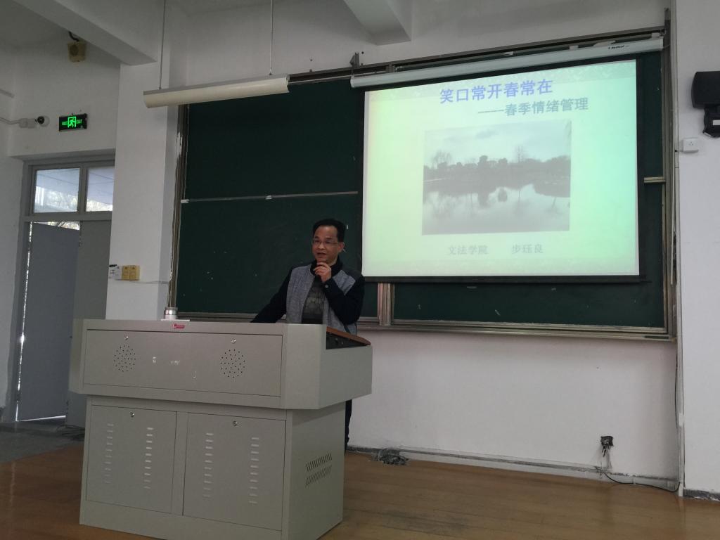 为减轻教职工的工作压力,以更饱满的精神状态投入教学、科研和社会服务工作,3月29日下午,利用周四教职工集中学习时间,啪啪啦 工会邀请啪啪啦 党委副书记、心理咨询师步珏良为全体教职工做了《笑口常开春常在》的专题辅导讲座。