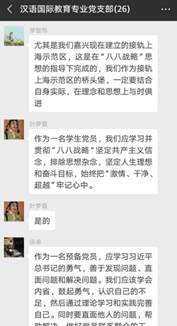 学院党委书记洪坚在讨论中指出,八八战略是习近平总书记当年主政浙江时,结合浙江实际,创造性地提出的八个方面的优势和八个方面的举措,具有长期实践意义,通过认真学习,我们会发现党的十九大以来的诸多大政方针均与其存在联系。法学专业党支部书记虞岚认为,“八八战略”的伟大实践是浙江15年来经济文化社会各方面实现跨越式发展的重要保证,在当下仍然需要坚持落实。法学学科党支部书记周述荣谈到,“八八战略”是习近平新时代中国特色社会主义思想在浙江萌发与实践的集中体现,对于学习研究习近平新时代中国特色社会主义思想具有重要的理论价值。文学学科党支部组织委员白春苏认为“八八战略15年”正是浙江文化事业大繁荣大发展的15年,中文系应该牢牢把握历史机遇,强化专业建设,全力迎接专业审核性评估。汉语国际教育专业党支部书记单智伟结合嘉兴的发展实际,认为嘉兴现在建立的接轨上海示范区,就是在“八八战略”思想指导下完成的,党员们应该认真加以学习,做到理论和思想上的与时俱进。汉语言专业党支部学生党员顾佳欢在讨论中发言,八八战略展现了习近平总书记在浙江工作期间对浙江发展战略的高瞻远瞩、充分体现了习近平总书记对人民的赤子情怀。