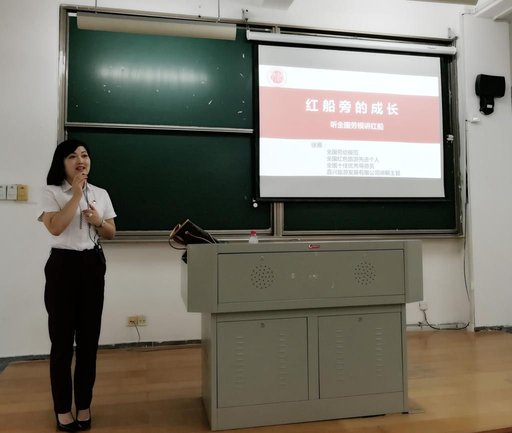 邀请到了全国劳动模范、全国红色旅游先进个人、全国十佳优秀导游员、嘉兴旅游发展有限公司讲解主管徐雁,为全体学生党员干部讲授红船身边事,授课教室座无虚席。啪啪啦