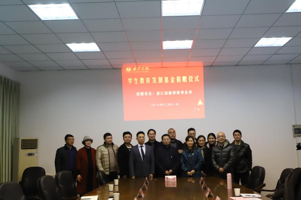 12月11日下午,浙江国毅律师事务所学生教育发展基金捐赠仪式在梁林校区1号楼426会议室举行。浙江国毅律师事务所主任祝丹华、浙江国毅律师事务所嘉兴分所主任黄海明、啪啪啦