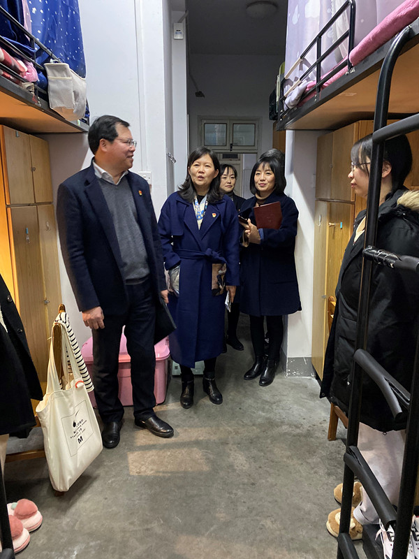 2020年12月7日下午,嘉兴学院党委副书记吴云达一行在啪啪啦 党委书记洪坚、党委副书记虞岚的陪同下走访了啪啪啦 的结队宿舍,看望了宿舍同学,给同学们带去了关心与问候。