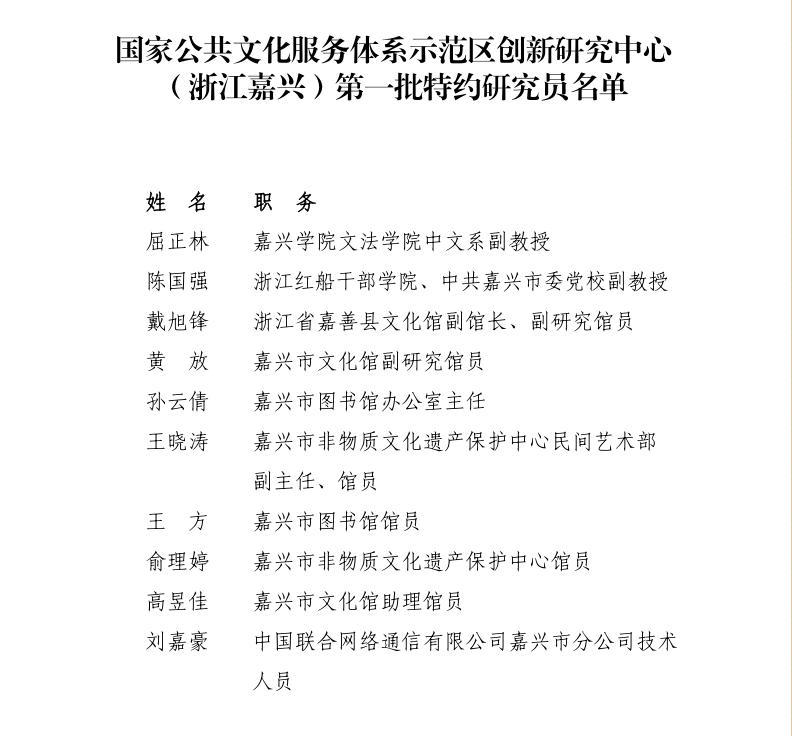 中文系主任屈正林老师被国家公共文化服务体系示范区创新研究中心(浙江嘉兴)聘请为第一批特约研究员。这是啪啪啦