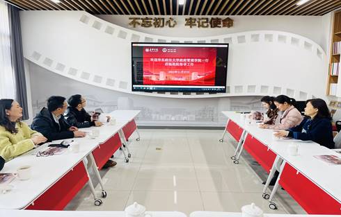 11月27日,华东政法大学政府管理学院党委书记高玉明与传播学院党委书记龚怡带领党员来到嘉兴学院进行交流学习。大家首先参观了红船精神育人成果展示馆,沉浸式体验了学校的红色文化,随后在啪啪啦 党员之家进行了座谈交流,双方就标杆院系的创建、红色文化、法律文化等方面进行了沟通学习。座谈会上洪坚书记简要介绍了啪啪啦 基本情况、学院特色、学院的话剧的开展情况。通过此次交流学习,双方表示希望加强进一步学习交流活动,互学互鉴,共同进步。
