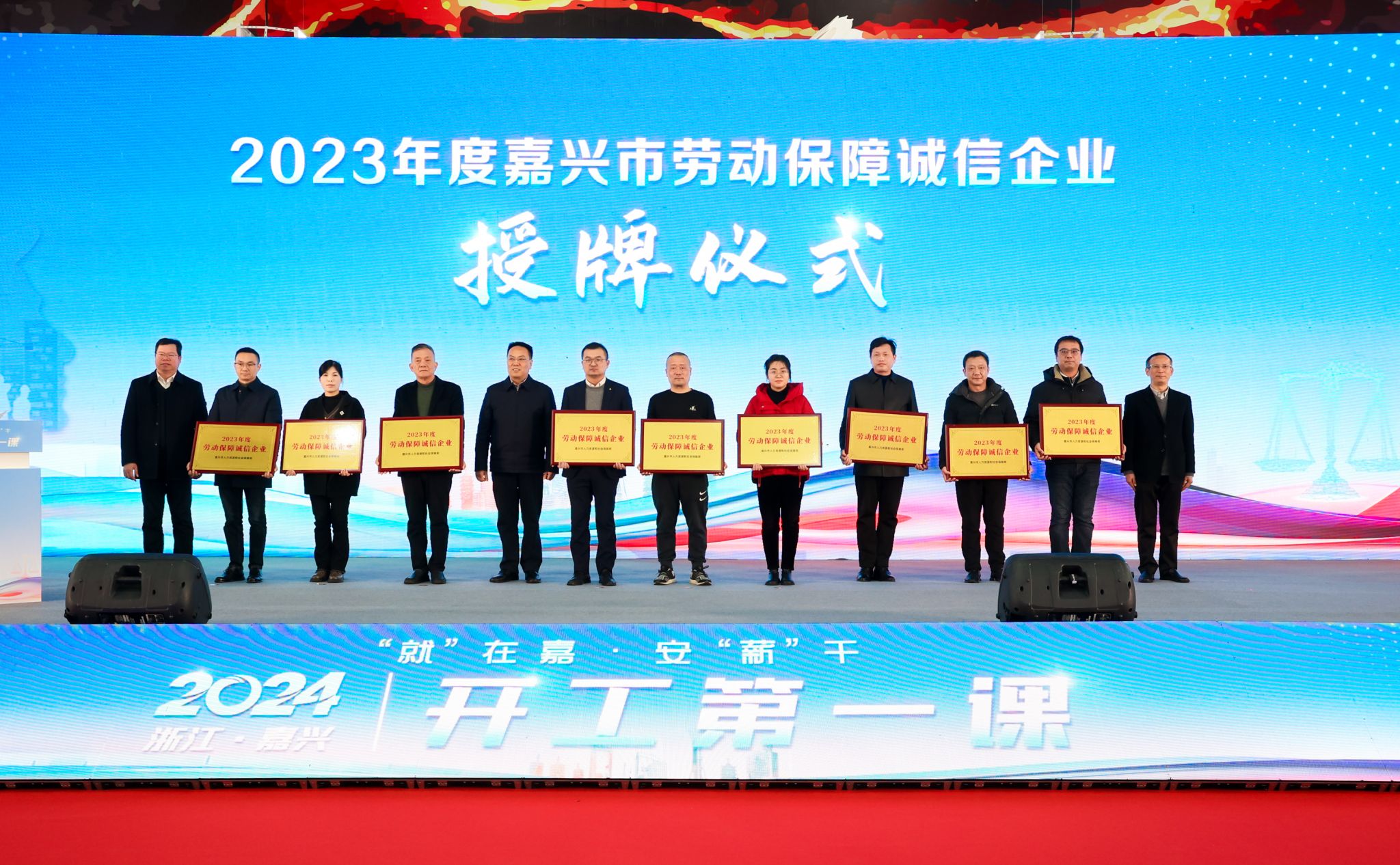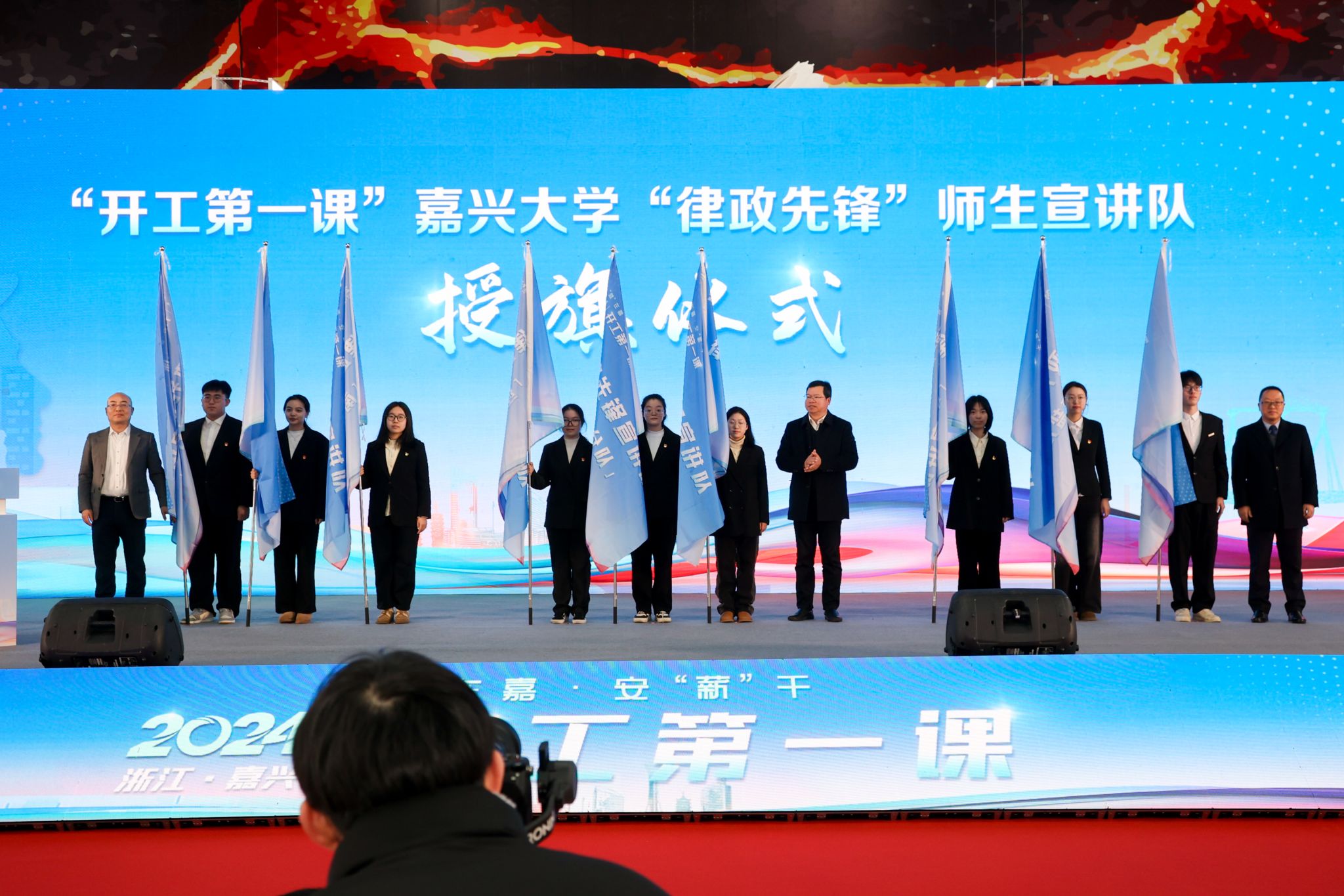 ‘律政先锋’师生宣讲队正式成立”,吴云达、杨克建、童建华分别向9个“律政先锋”分队授旗。仪式上公布了“2023年度嘉兴市劳动保障诚信企业”,并由邢海华、吴云达、吴国明分别给劳动保障诚信企业颁发铜牌。啪啪啦