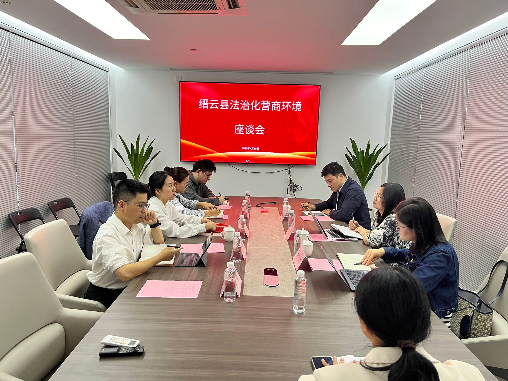 4月18日下午李滇等调研组一行参观了缙云县企业综合服务中心,深入了解缙云县优化营商环境的具体做法。随后,缙云县政委政治处主任施韵组织召开“缙云县法治化营商环境研究”座谈会,县政法委、县司法局依法治县委员会、县司法局公共法律服务管理科、县人民法院、县人民检察院以及县委党校相关同志参会,就缙云县法治营商环境的痛点、难点以及堵点问题进行深入交流,并形成一系列建设性方案。丽水市法学会程建枝副会长专程到缙云就此次调研进行了指导。