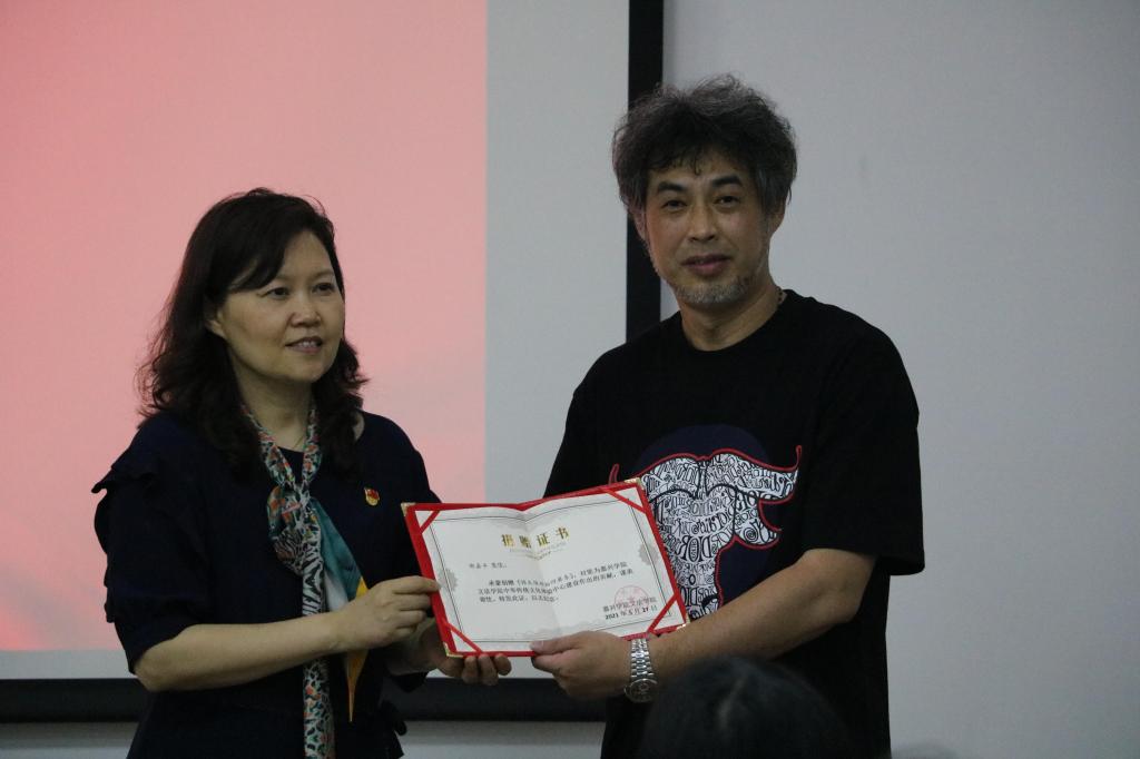 捐赠交接仪式上,邵嘉平向大家展示并介绍捐赠物——《锦灰堆砖拓四屏条》,其精美的造型与工艺让大家大开眼界,洪坚为邵嘉平颁发捐赠证书,随后还举行了校外专家聘任仪式。