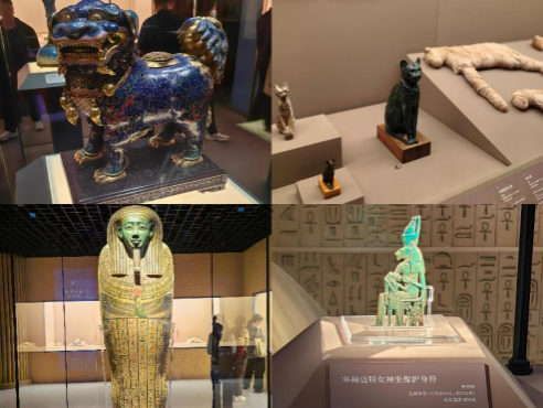 午后12:30,研学队伍移步上海博物馆。当讲解员揭开“金字塔之巅——古埃及文明特展”的神秘面纱时,展厅内瞬间响起此起彼伏的惊叹声特展由法老的国度”、“萨卡拉的秘密”、“图特卡蒙的时代三部分组成——木乃伊棺椁上的象形文字在交互屏上实时翻译,制作木乃伊的“黄金分割”防腐流程通过3D动画直观呈现,同学们或蹲身观察圣甲虫护身符的矿物颜料成分,或对照《罗马法》课程笔记探讨古埃及契约文书中的权利义务关系。
